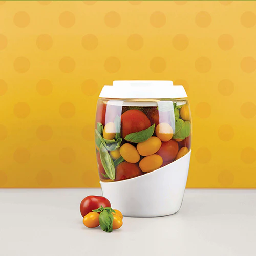 El interior de todas las vasijas y jarras Mortier Pilon es 100% vidrio. Las partes blancas en el exterior de las vasijas y tarros están hechas de plástico no reactivo, libre de BPA y no entran en contacto con los alimentos.