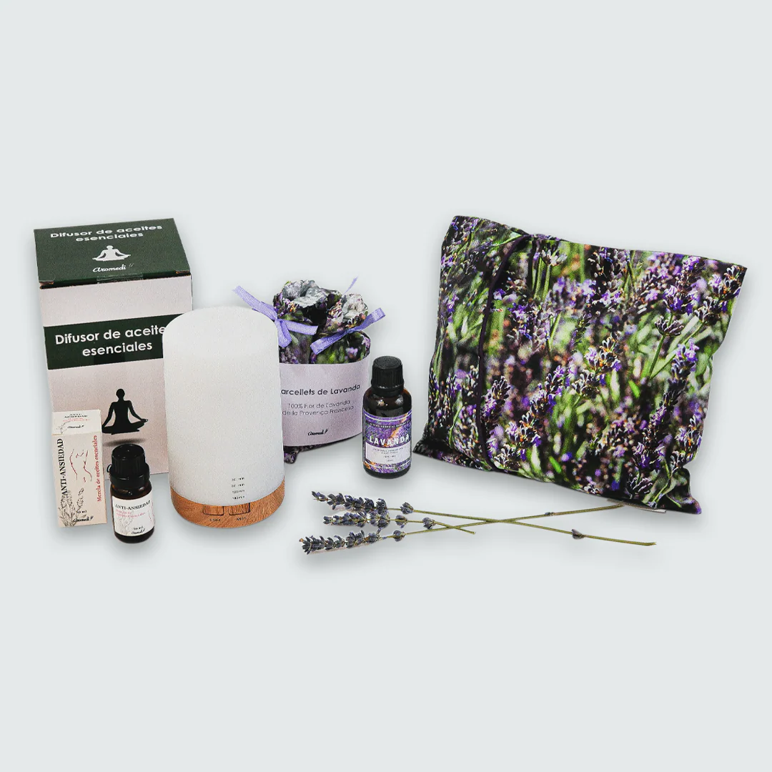 Este pack contiene: 1 Pack con 3 saquitos de Lavanda para armarios, 1 Aceite esencial de Lavanda, 1 Mezcla de Aceites Esenciales Anti-Ansiedad, 1 Difusor de Aceites Esenciales de Sobremesa más 1 cojín relleno de Lavanda de 20 x 20 cm con funda estampada con la foto de la lavanda.