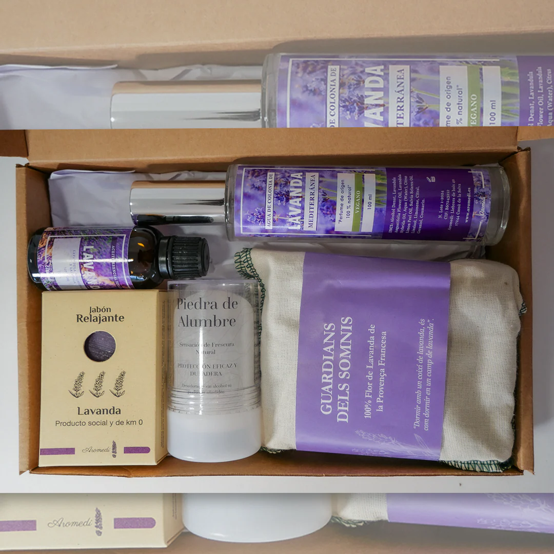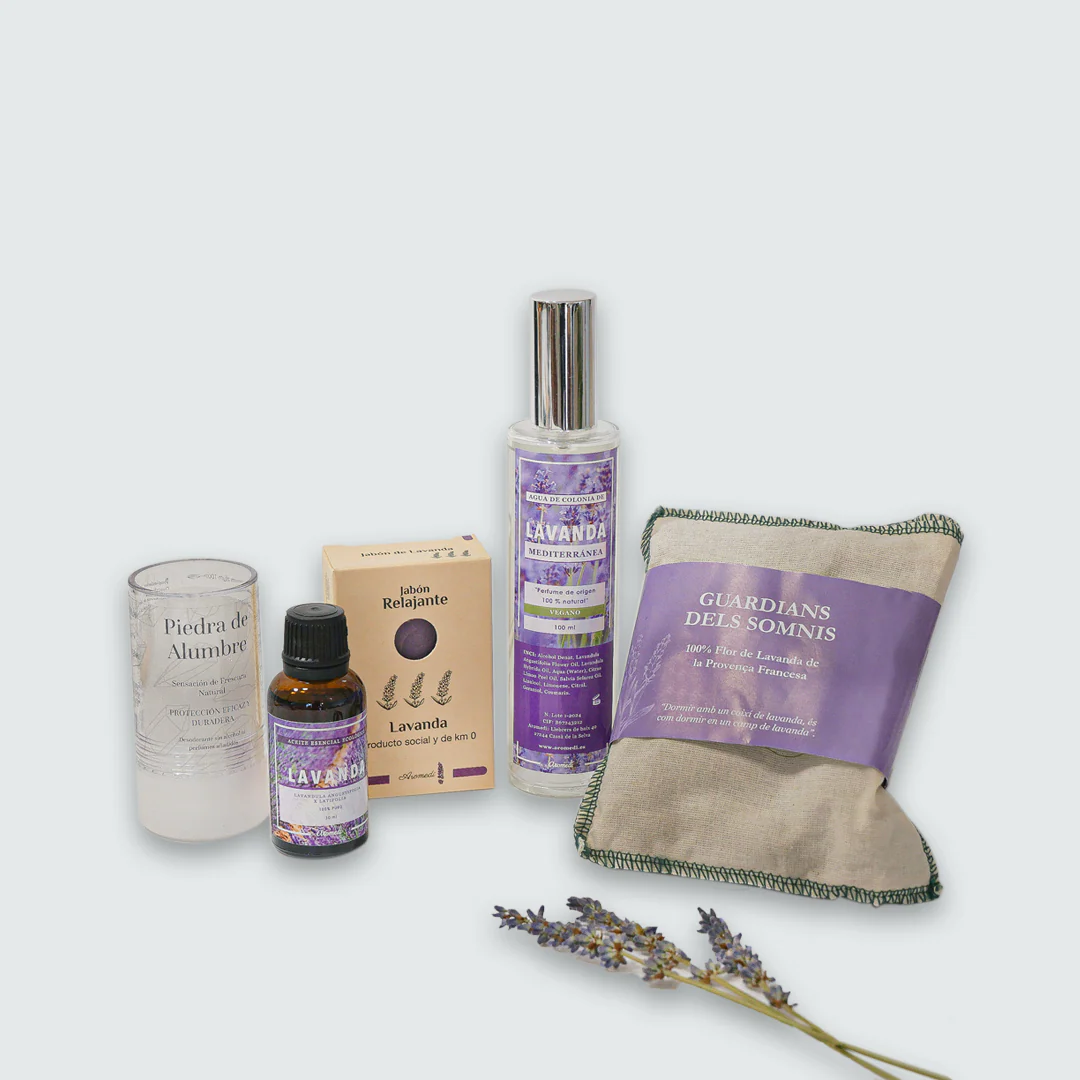 Este pack contiene: 1 Desodorante natural de Piedra de Alumbre, 1 Aceite esencial de Lavanda, 1 Jabón de Lavanda natural, 1 Agua de Colonia de Lavanda y 1 Guardián del Sueño.