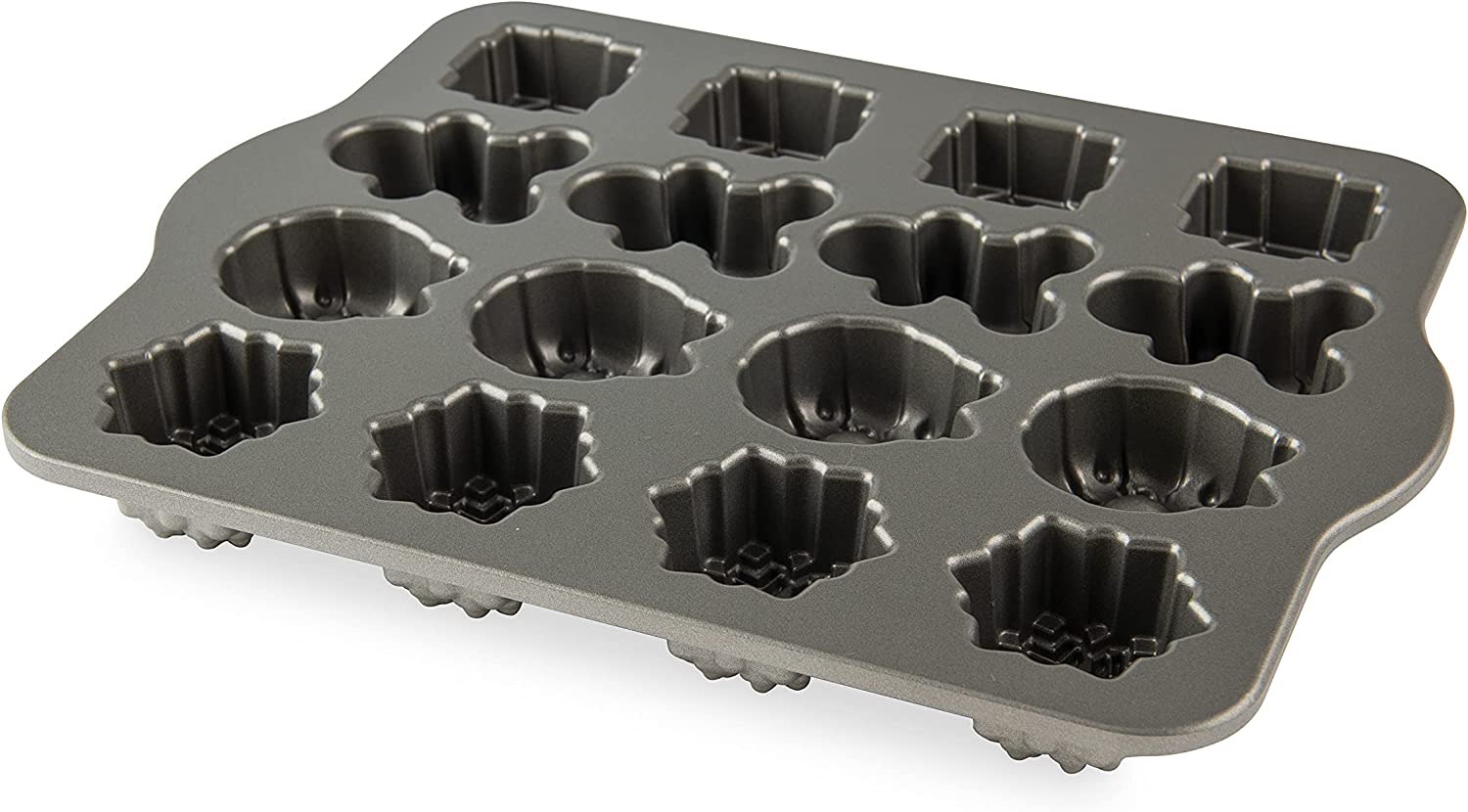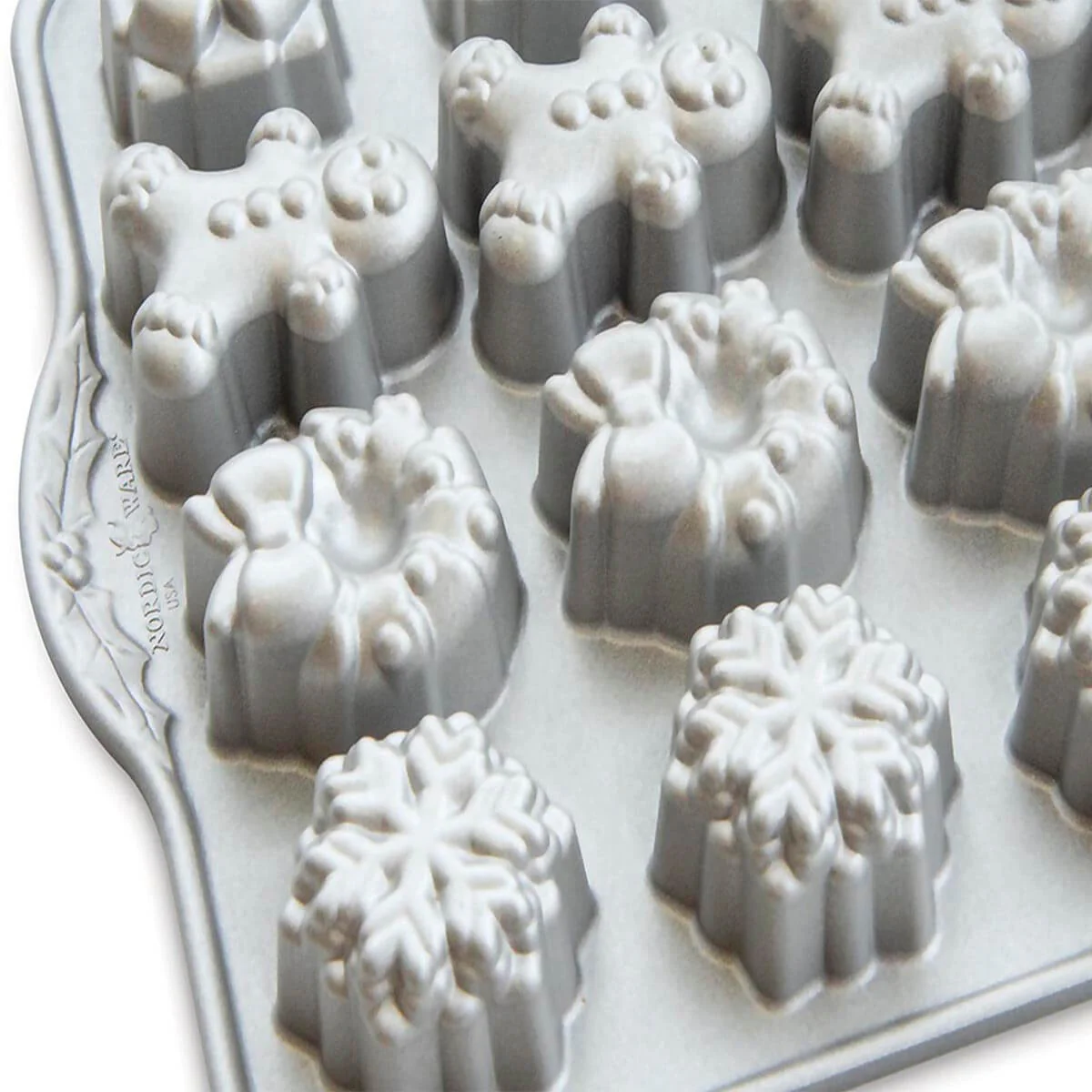 Paquetes y coronas de flores, copos de nieve en espiral y niños de pan de jengibre adornan esta sartén navideña de recuerdo. Los pasteles regalables del tamaño de un bocado son hermosos directamente del horno, o agregue un poco de brillo con glaseado y espolvoreos. Perfecto con una taza de té festiva, querrás hornear varios lotes para compartir. Hecho de aluminio fundido para excelentes resultados de horneado con antiadherente para una fácil liberación y limpieza.
