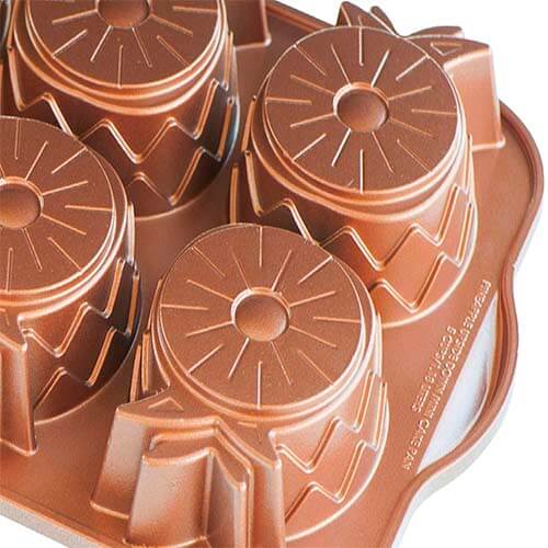 Molde para hornear seis panques mini piñas de 1.180 litros de capacidad diseñado para brindar a los panaderos caseros creativos resultados de panadería gourmet. Molde fabricado en aluminio fundido de uso comercial de alta resistencia que brilla con un atractivo acabado de cobre. La superficie antiadherente de cobre premium libre de PFOA / PTFE liberará su pastel de manera fácil y limpia.