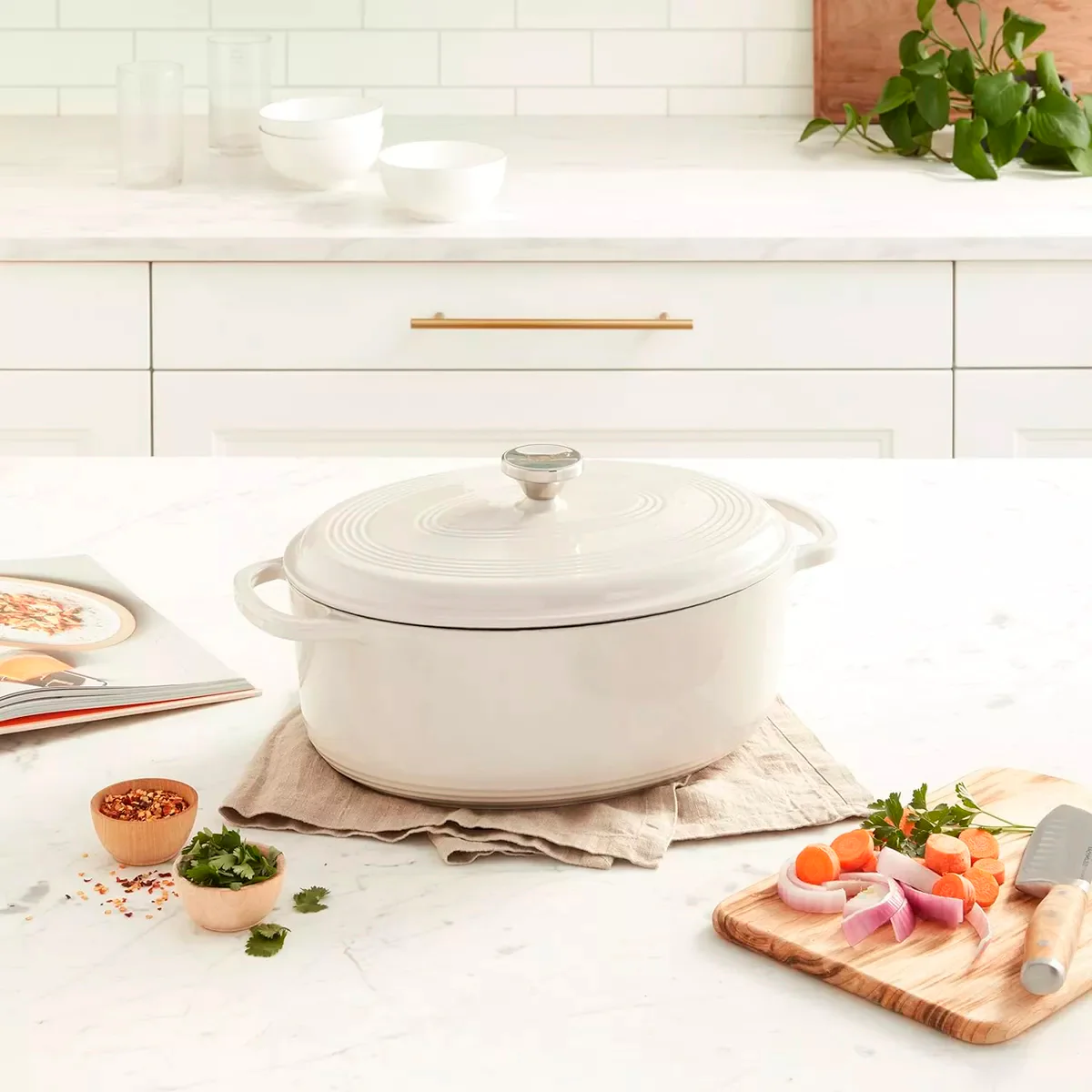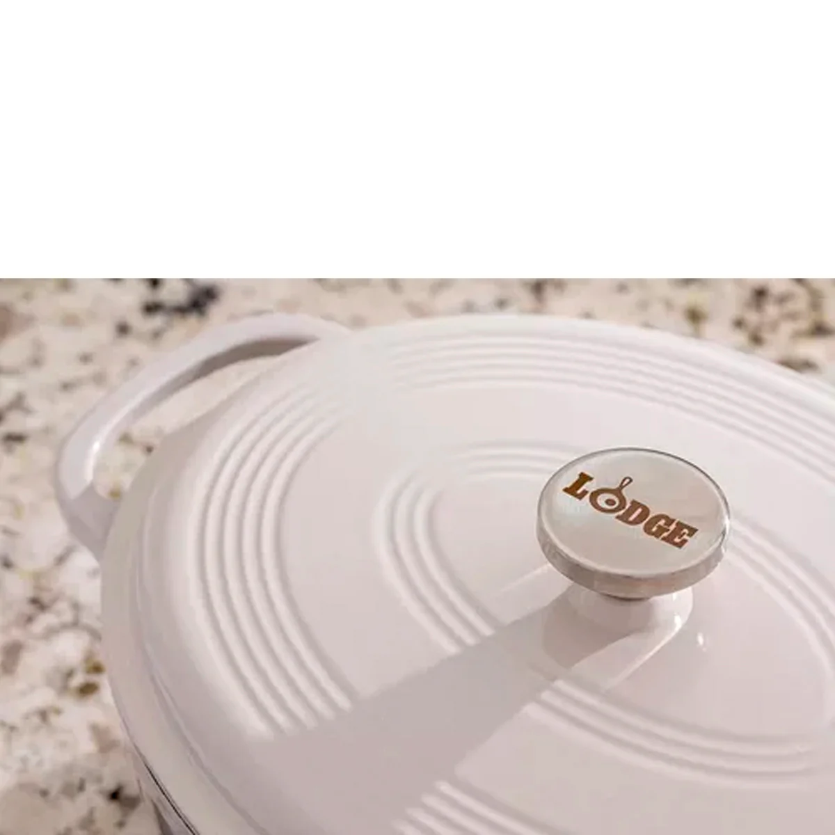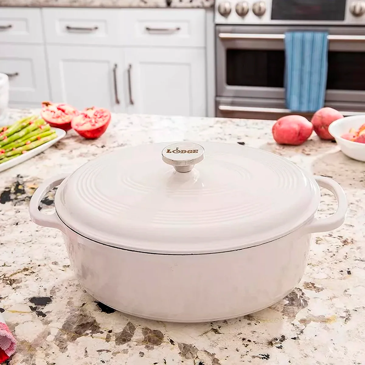 Diseñado y fabricado por Lodge, este horno holandés tiene una elegante forma ovalada, un exterior de color blanco ostra y un interior blanquecino que agrega un toque de clase a cualquier cocina e impresionará a sus invitados.