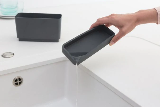 Con este organizador Sinkside de Brabantia para fregadero podrás guardar tus utensilios con estilo. No te dejes engañar por su diseño compacto; tiene espacio suficiente para guardar los estropajos, bayetas, cepillos para lavar platos y mucho más. Los utensilios se sostienen hacia arriba gracias a su fondo acanalado. Tiene también una bandeja recogegotas independiente y de silicona que es antideslizante, para que no se mueva de su sitio. ¡Un auténtico tesoro!