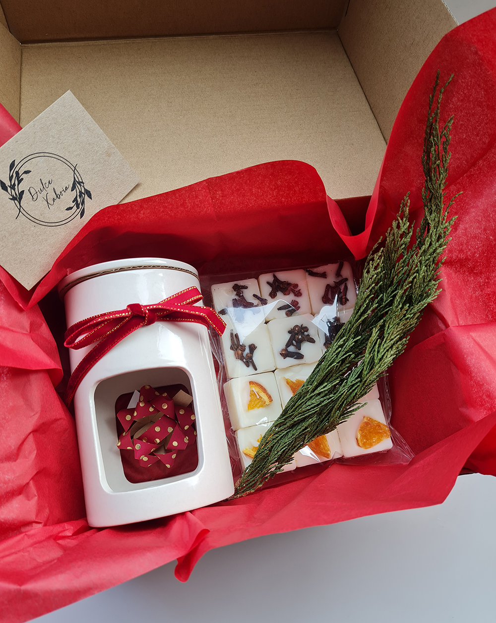 Pack regalo, quemador de wax melts de ceramica con 12 melts de naranja y canela y clavo y vainilla y 4 velas de te, en caja regalo.