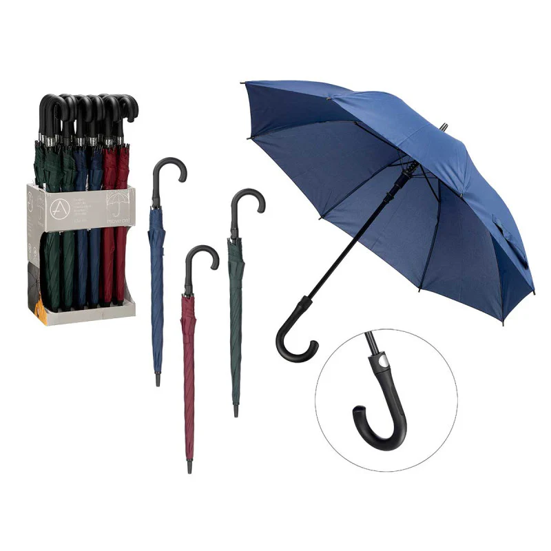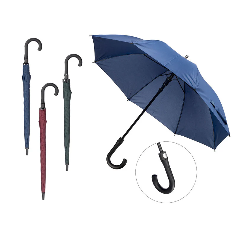Resguárdate de la lluvia con estilo y comodidad gracias a este paraguas largo automático, disponible en elegantes colores neutros como azul marino, granate y verde oscuro. Fabricado con materiales de alta calidad como tela pongee 100% poliéster, estructura de acero y varillas de fibra de vidrio, garantiza resistencia y durabilidad incluso en días ventosos.