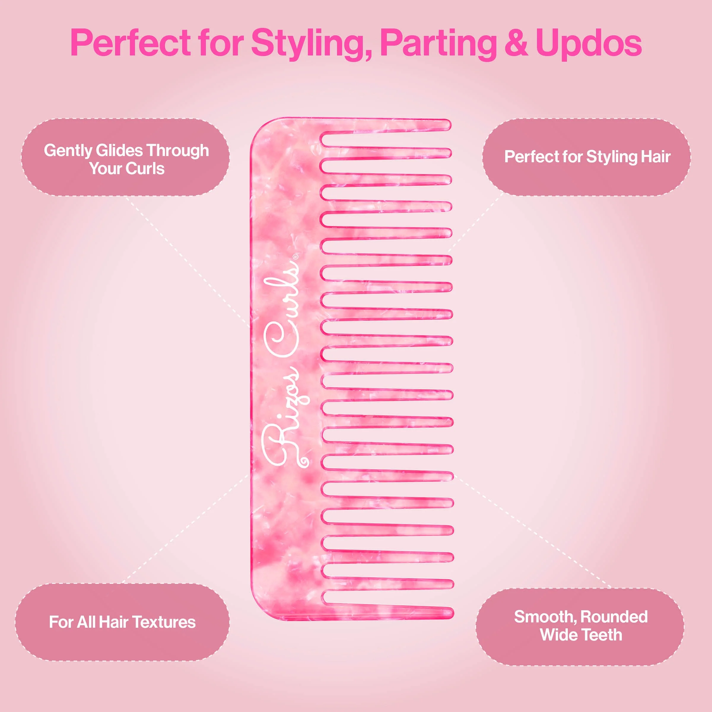 Nuestro peine de peinado de dientes anchos rosados de Rizos Curls presentadientes anchos que son perfectos para peinar tus rizos! Usarlo para una ¡Separando suavemente su cabello, creando recogidos y muchas más necesidades de peinado! Está fabricado en nuestro hermoso material de acetato moteado rosa Luxe. Es un peine de material de alta calidad que se desliza suave y fácilmente a través de tus rizos.