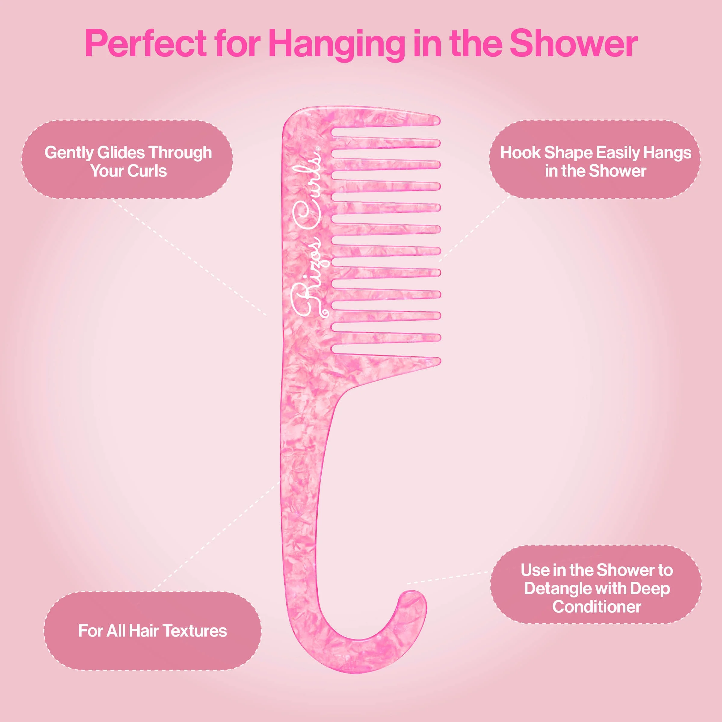 ¡Nuestro peine de ducha colgante Rizos Curls rosa viene en forma de gancho perfecto para desenredar y colgar fácilmente en la ducha! Tiene un mango fácil de sostener, perfecto para desenredar suavemente tus rizos en la ducha mientras aplicas nuestro acondicionador profundo por todo el cabello. ¡Está hecho en un hermoso material de acetato moteado translúcido rosa de alta calidad que es súper lindo!