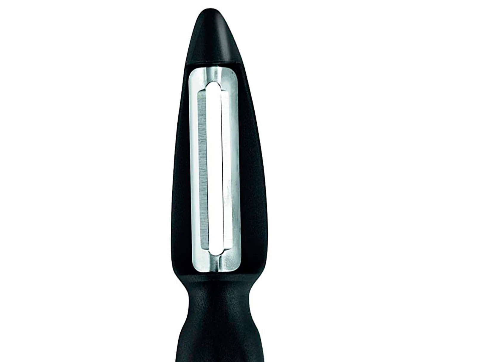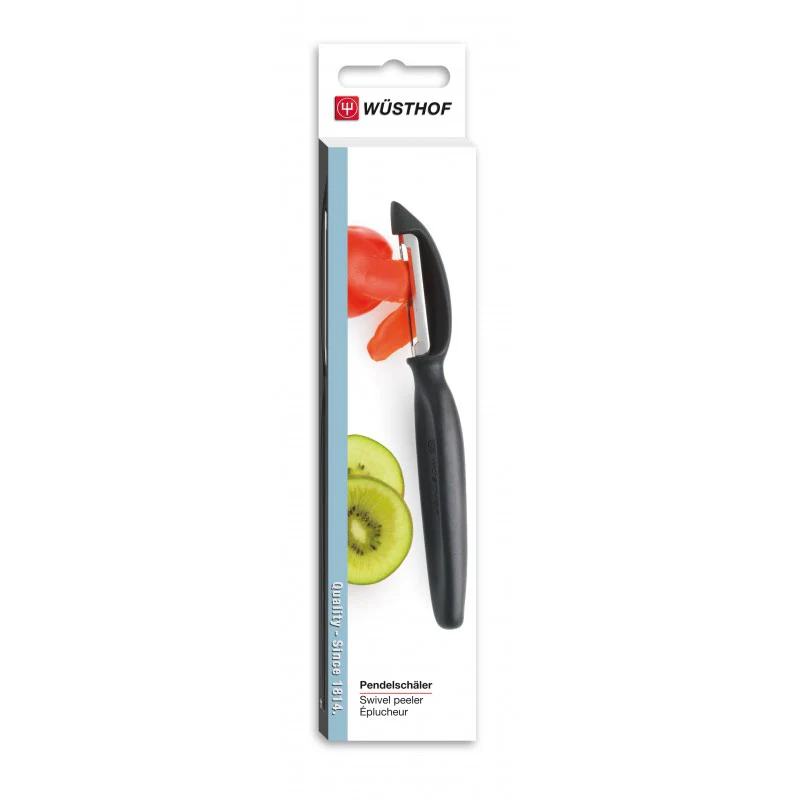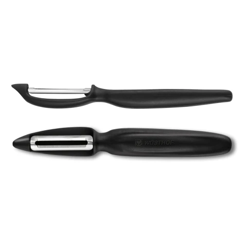 Pelador Wüsthof elaborado en acero, color negro y nombre de la marca en relieve. Con el pelador de verduras clásico, pueden procesarse frutas y verduras. La hoja móvil y ancha consigue pelar pieles especialmente finas. Como la hoja está dispuesta transversalmente respecto al mango redondeado, el proceso de pelado es rápido y sencillo y sin cansancio de las articulaciones.