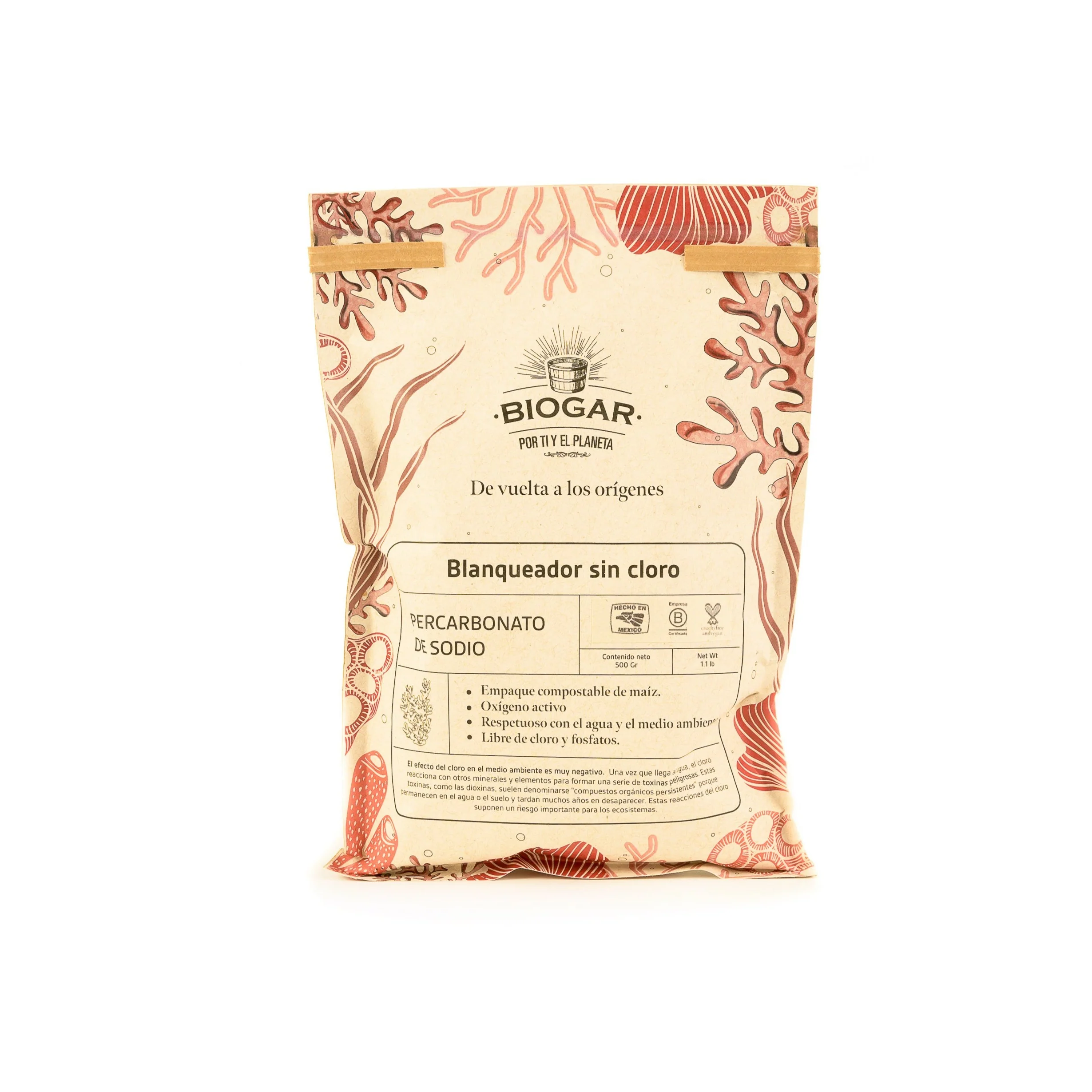 El blanqueador sin cloro (percarbonato de sodio), también conocido como oxígeno activo, es un excelente blanqueador y quita manchas que no contiene cloro ni fosfato, respetando las aguas y el medio ambiente.