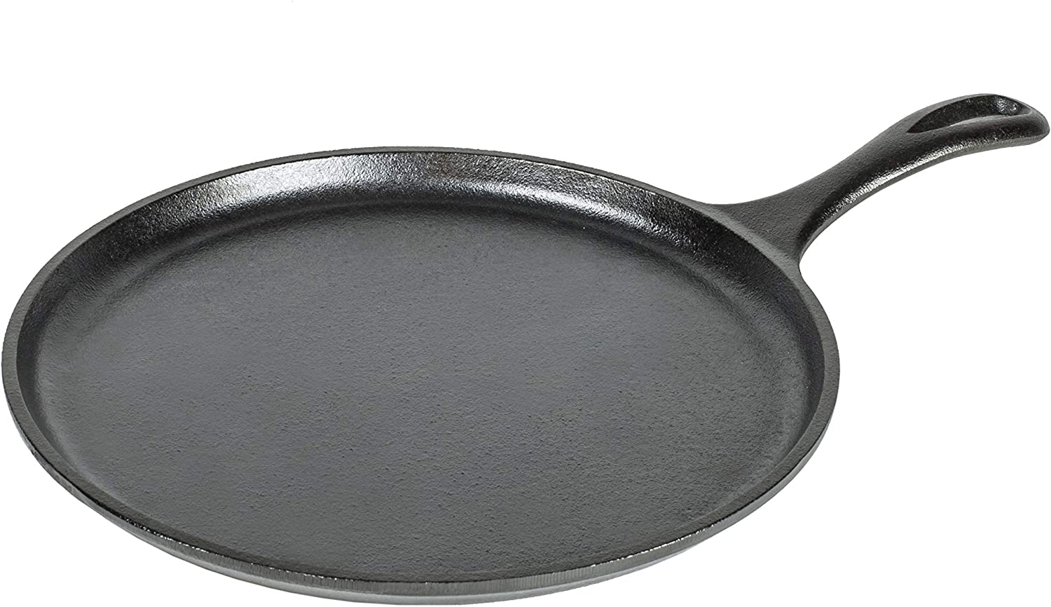 Plancha redonda 26 cm hierro fundido color negro con mango y bordes ligeramente elevados mantienen el aceite, la mezcla y otros ingredientes perfectamente contenidos. Retiene el calor para mantener la comida caliente como un plato de servir.