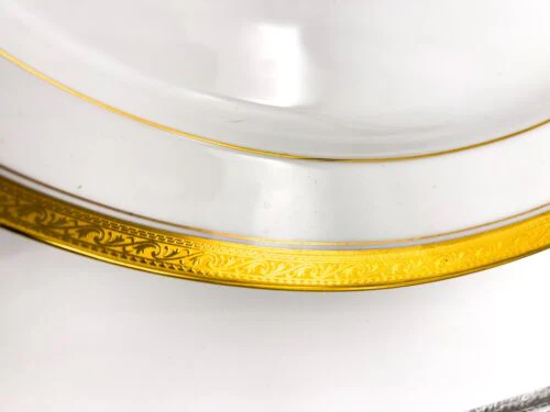 Noritake Crestwood Gold tiene un cuerpo blanco bordeado con una ancha banda dorada grabada para presentar una apariencia de elegante sencillez. Elaborado en porcelana blanca con un borde dorado.