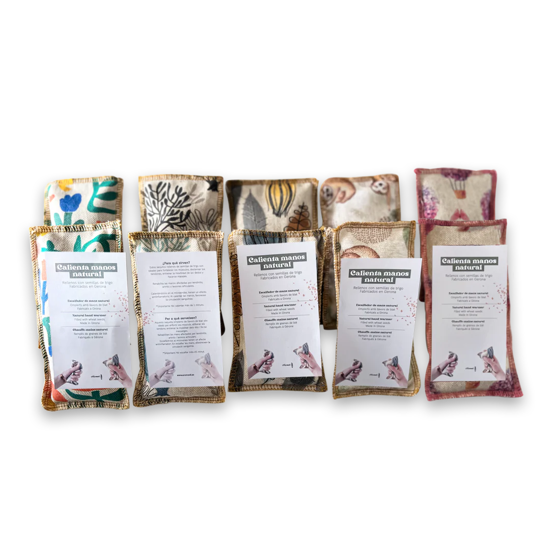 Los saquitos calienta-manos rellenos con trigo del Ampurdán son ideales para ejercitar las manos hinchadas o que necesitan prevención y/o rehabilitación por afecciones como la artritis, lesiones en el túnel carpiano u otros problemas de movilidad.