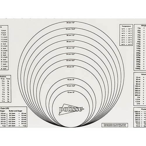 Tapete de silicon antiadherente y antideslizante resistente al calor de alta calidad para hornear. Impreso con diferentes graduaciones y medidas de conversión para facilitar su uso.