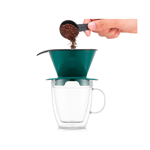 - agregue una cucharadita colmada o una cucharada Bodum de café para filtro recién molido en el cono filtrador.