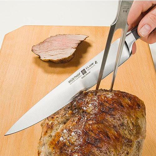 Con el tenedor para carne Wüsthof Gourmet de 16 cm, puedes girar fácilmente trozos de carne mientras los asa, mantener un rollo en su lugar mientras lo corta y colocar las rebanadas cortadas en los platos de sus invitados.