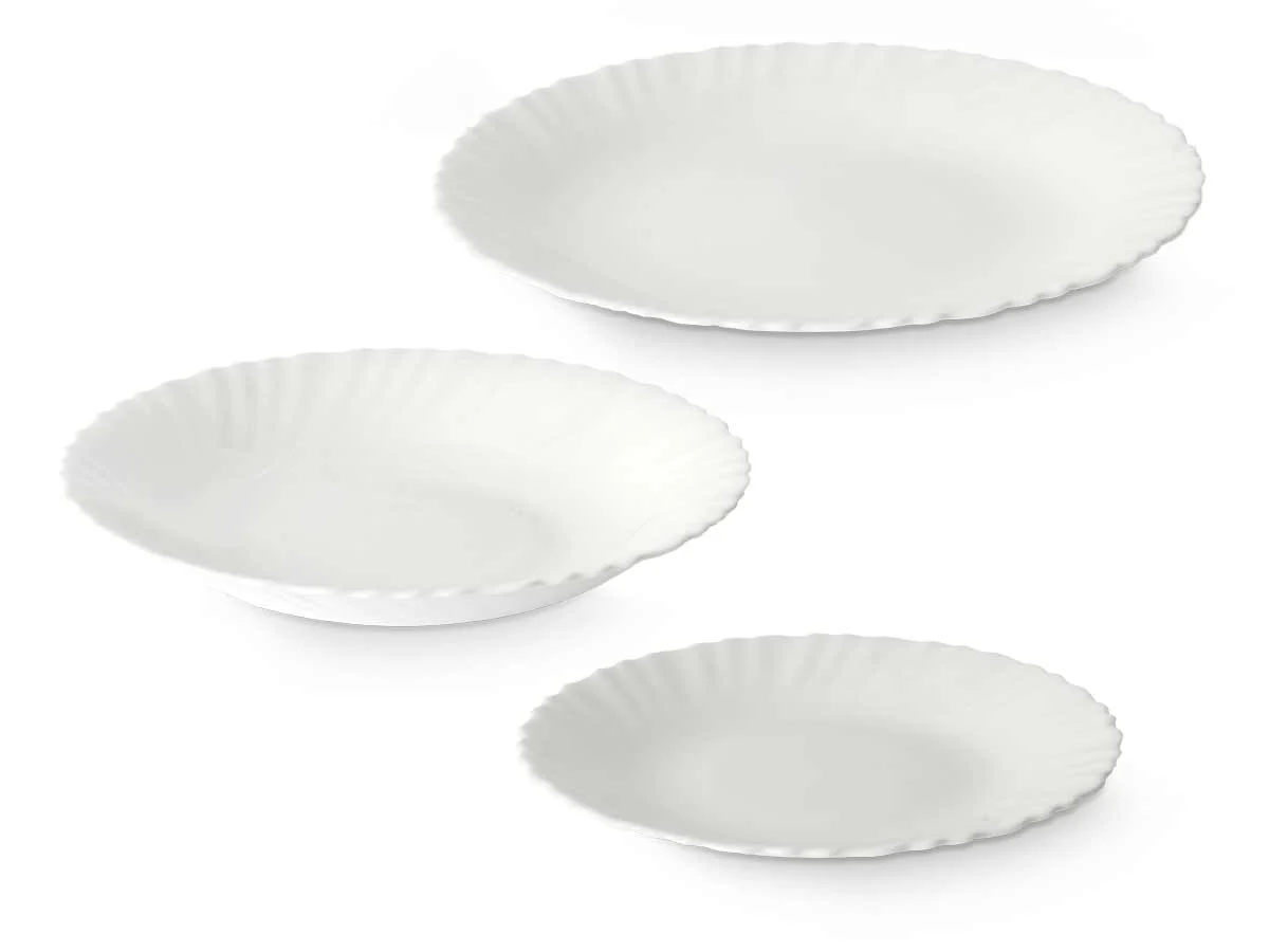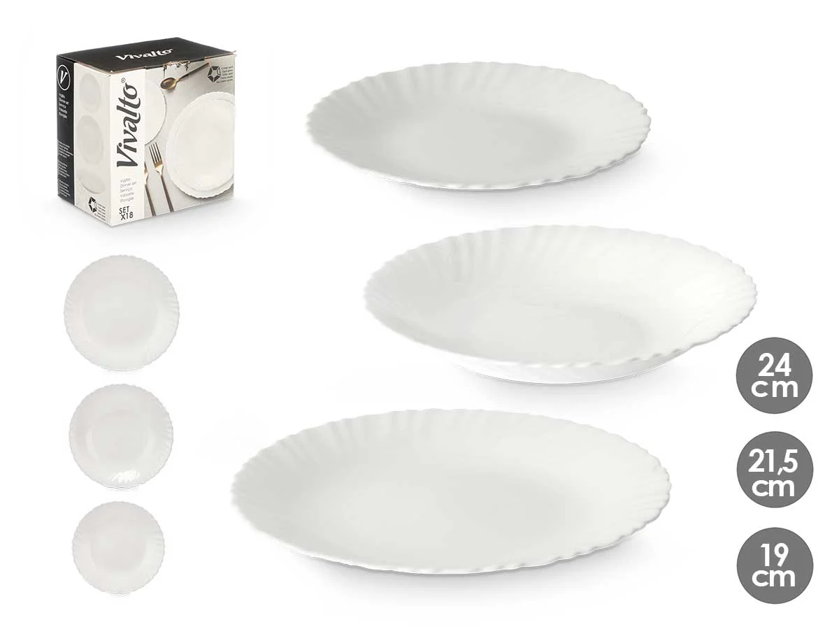 - Incluye 18 piezas distribuidas en 6 platos de 25 cm, 6 platos de 20 cm y 6 platos de 22 cm.