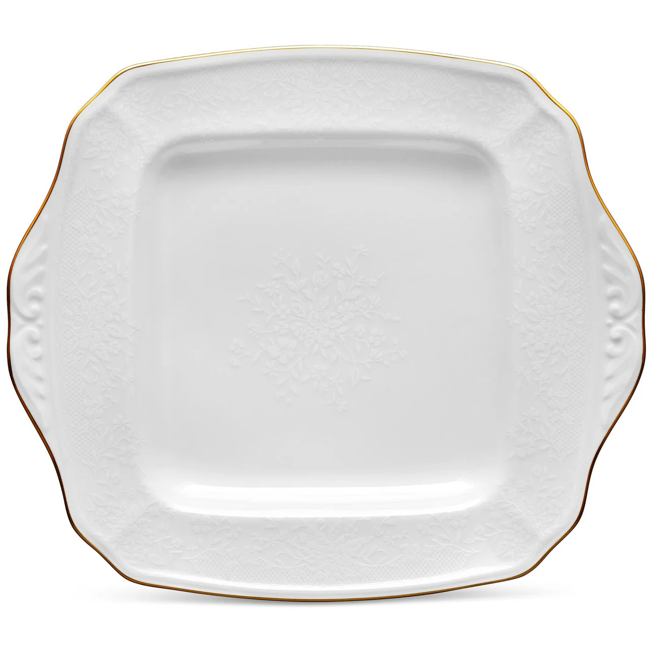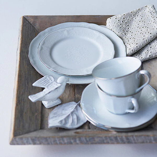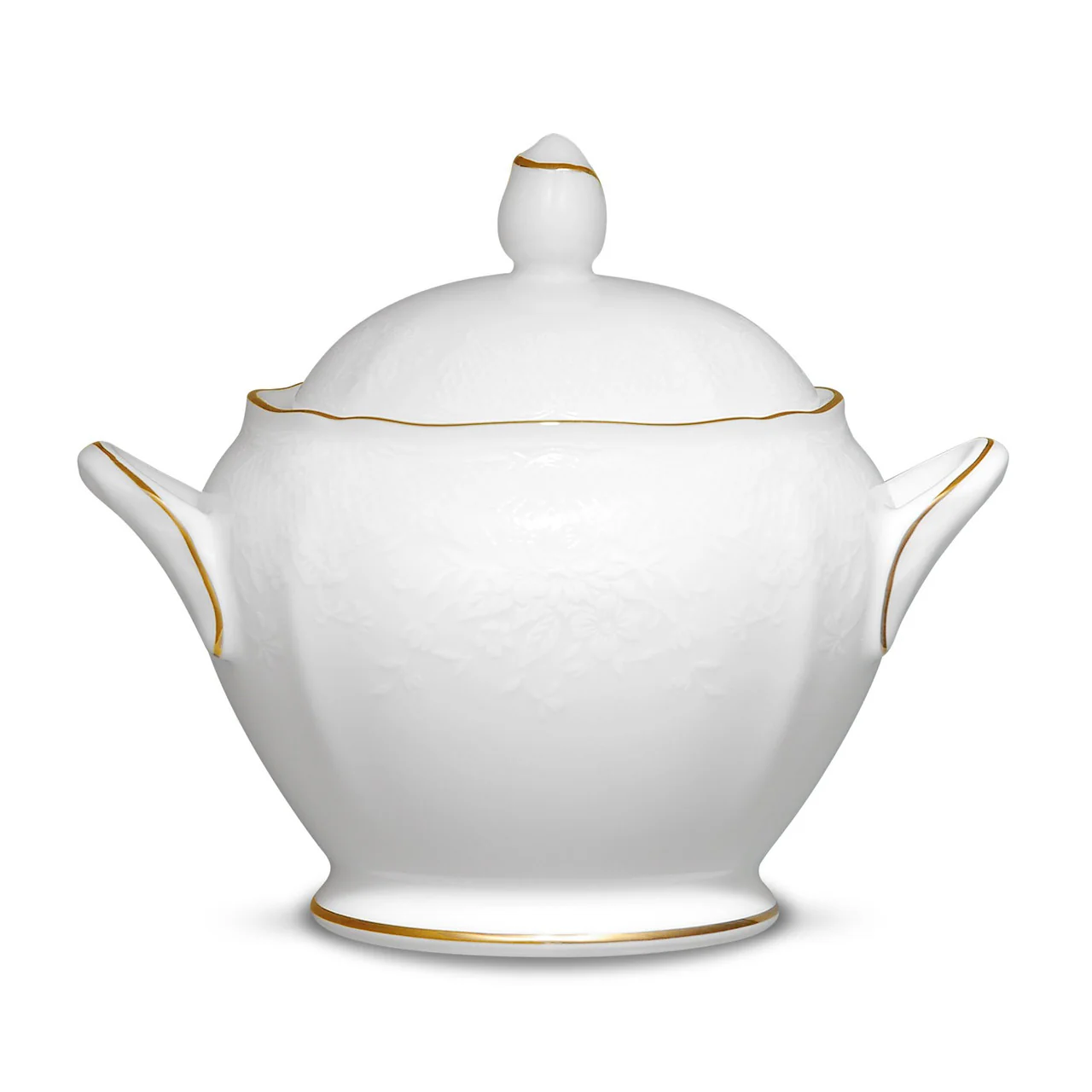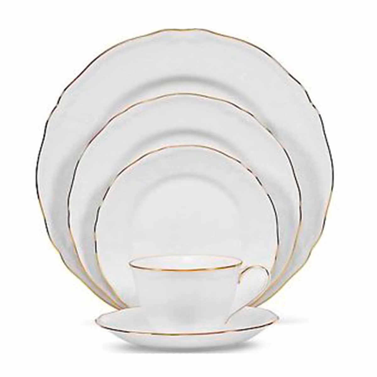 Princess Bouquet Gold presenta la aplicación más delicada en blanco sobre blanco de flores etéreas y encaje, combinada con un cuerpo de porcelana blanca con bordes festoneados distintivos y una delgada banda metálica.