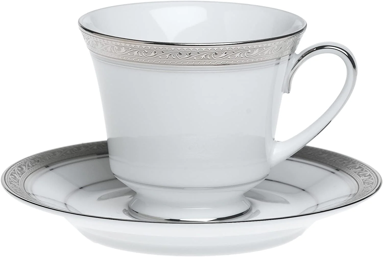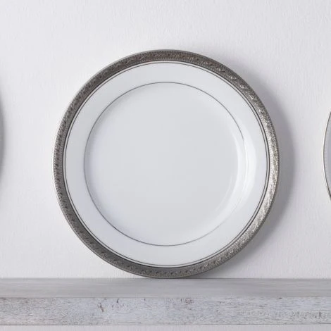 De la colección Legendary Fine China, Crestwood tiene un cuerpo blanco bordeado con una banda ancha de platino grabada para presentar una apariencia de elegante simplicidad.