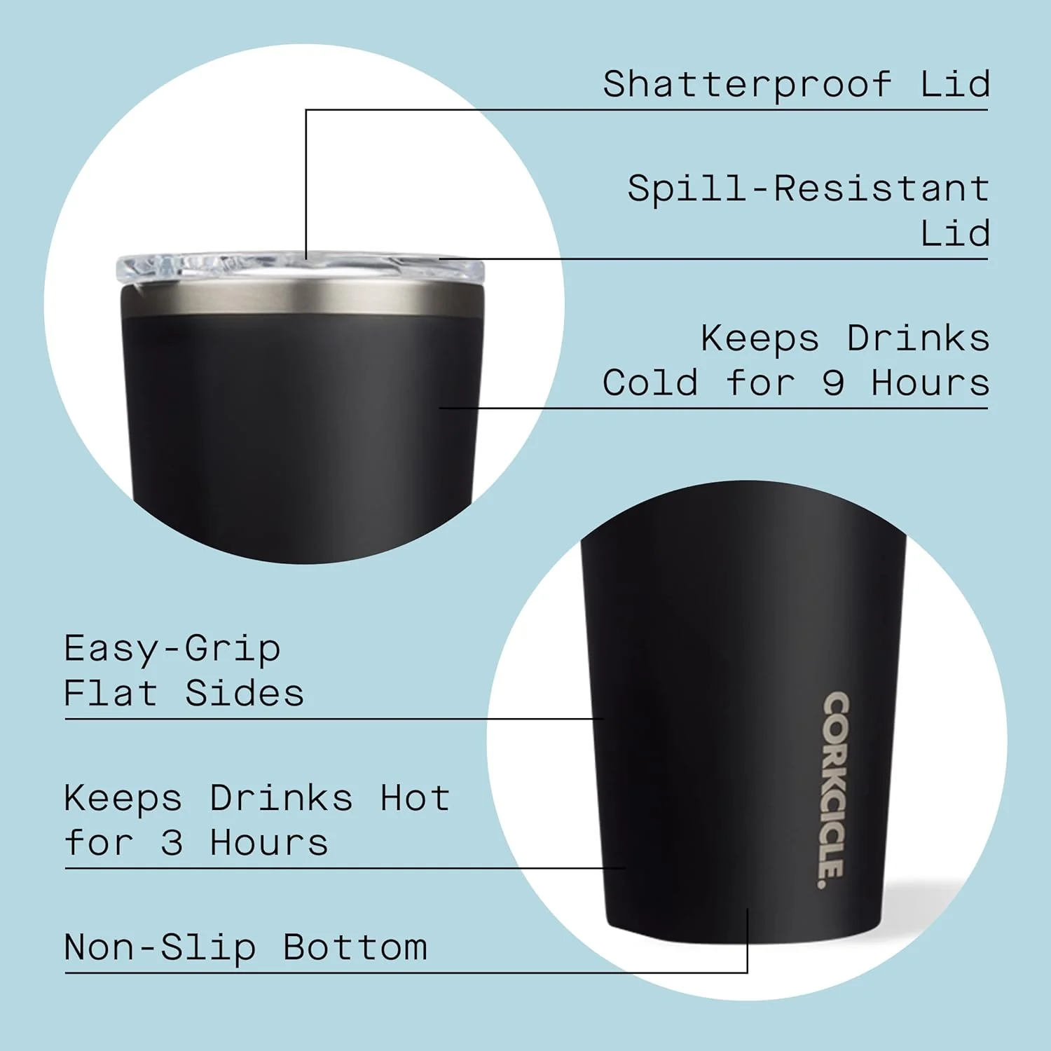 Con tres capas de aislamiento, esta elegante taza ofrece un control de temperatura inigualable. La base de silicona en la parte inferior agarra las superficies para evitar resbalones y deslizamientos. La tapa irrompible para sorber tiene un control deslizante incorporado para garantizar que su bebida permanezca dentro entre sorbos. Los lados y el asa patentados y de fácil agarre garantizan que el vaso permanezca seguro en su mano.