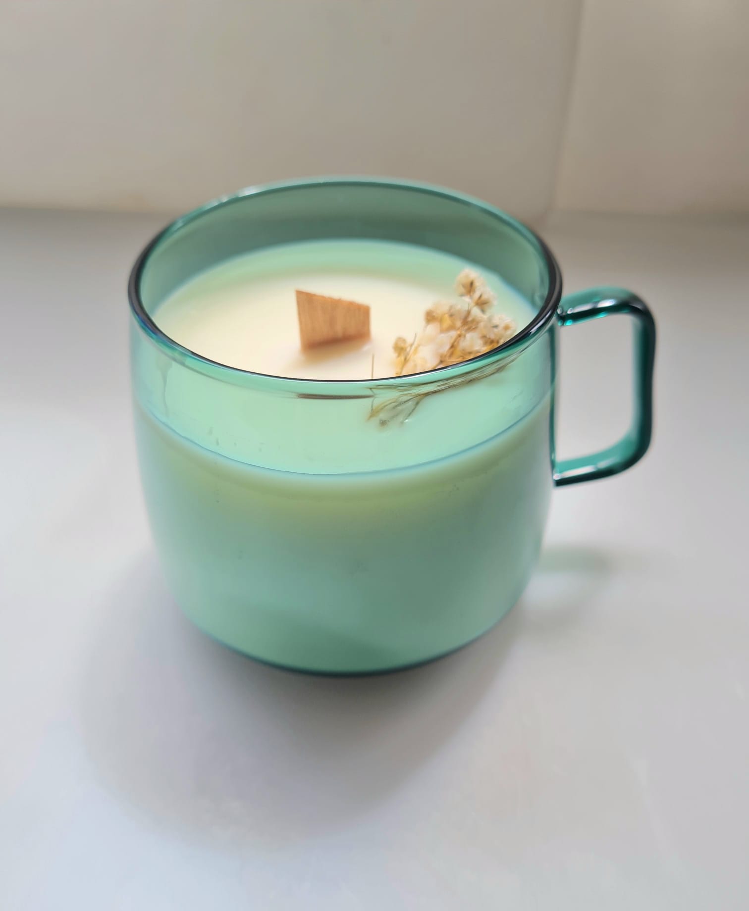 Vela de hogar «Tazavela» de cristal verde – Aroma mousse de limón