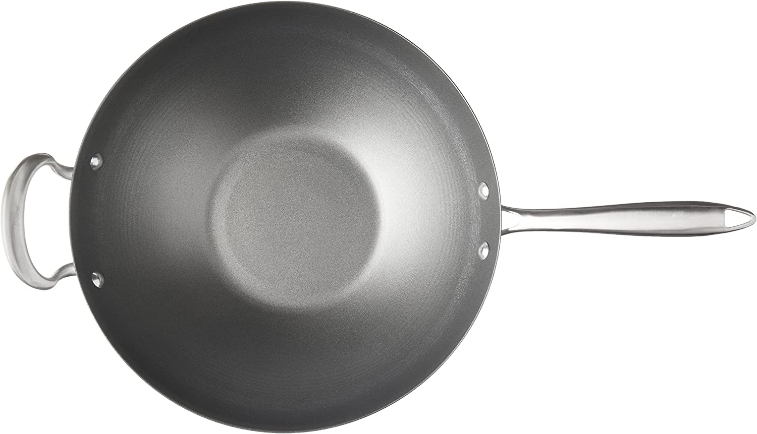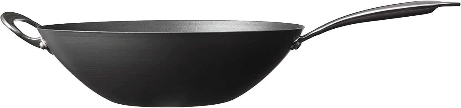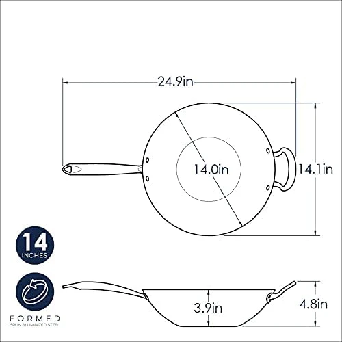 No solo para saltear, un wok grande puede ser uno de los utensilios de cocina más versátiles de su cocina. Más allá de saltear, el diseño hilado de lados altos de este wok permite freír, hervir y cocinar al vapor también. El mango principal de acero inoxidable que se mantiene fresco y el mango auxiliar fundido están remachados para mayor durabilidad y aseguran un agarre sólido al transferir grandes porciones de alimentos. El acero aluminizado se calienta rápidamente y garantiza un rendimiento sin oxidación durante la vida útil de este producto.